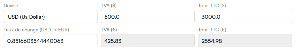 Clarté monétaire : Pour les factures en devises étrangères, le taux de change et la conversion dans votre devise de référence s'affichent désormais de manière limpide sur une ligne dédiée.
