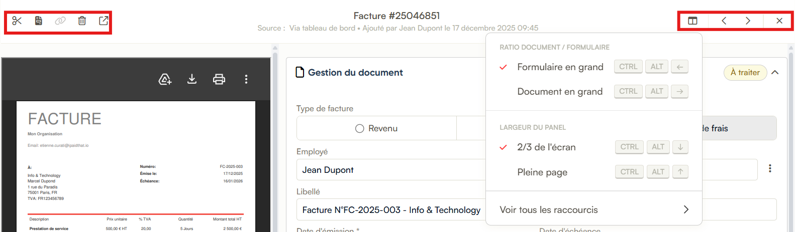 Ratio flexible : Préférez-vous une grande facture ou un grand formulaire ? Basculez entre les deux modes en un clic selon vos besoins de lecture.