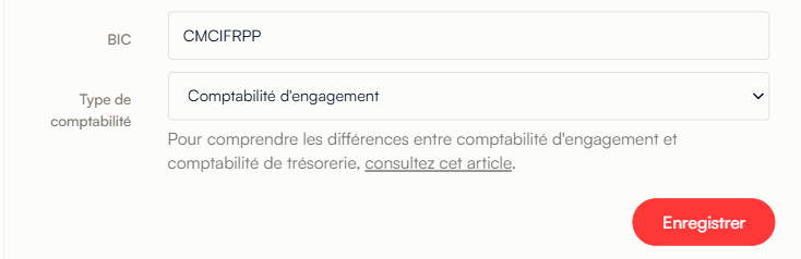 Page d'édition d'organisation : Un message d'aide explique les différences entre comptabilité d'engagement et de trésorerie avec un lien vers un article dédié.