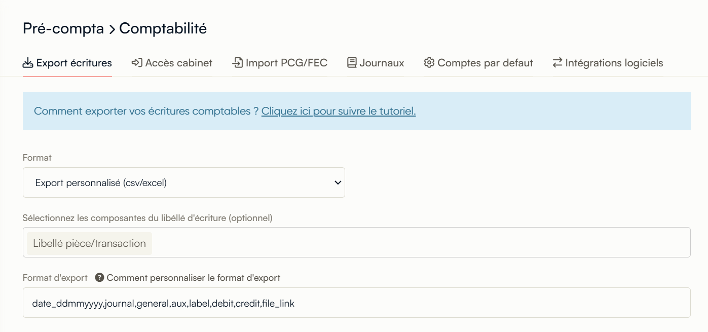 Page d'exportation personnalisée : Une alerte bleue guide désormais les utilisateurs vers un tutoriel détaillé pour exporter leurs écritures comptables.