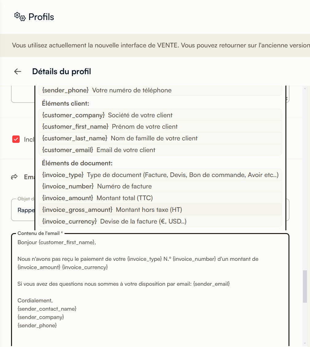 Dans vos Profils de facturation, vous pouvez dĂ©sormais intĂ©grer facilement des variables dans vos templates dâe-mails. Il vous suffit de placer votre curseur Ă lâendroit souhaitĂ© et de sĂ©lectionner la variable Ă insĂ©rer.