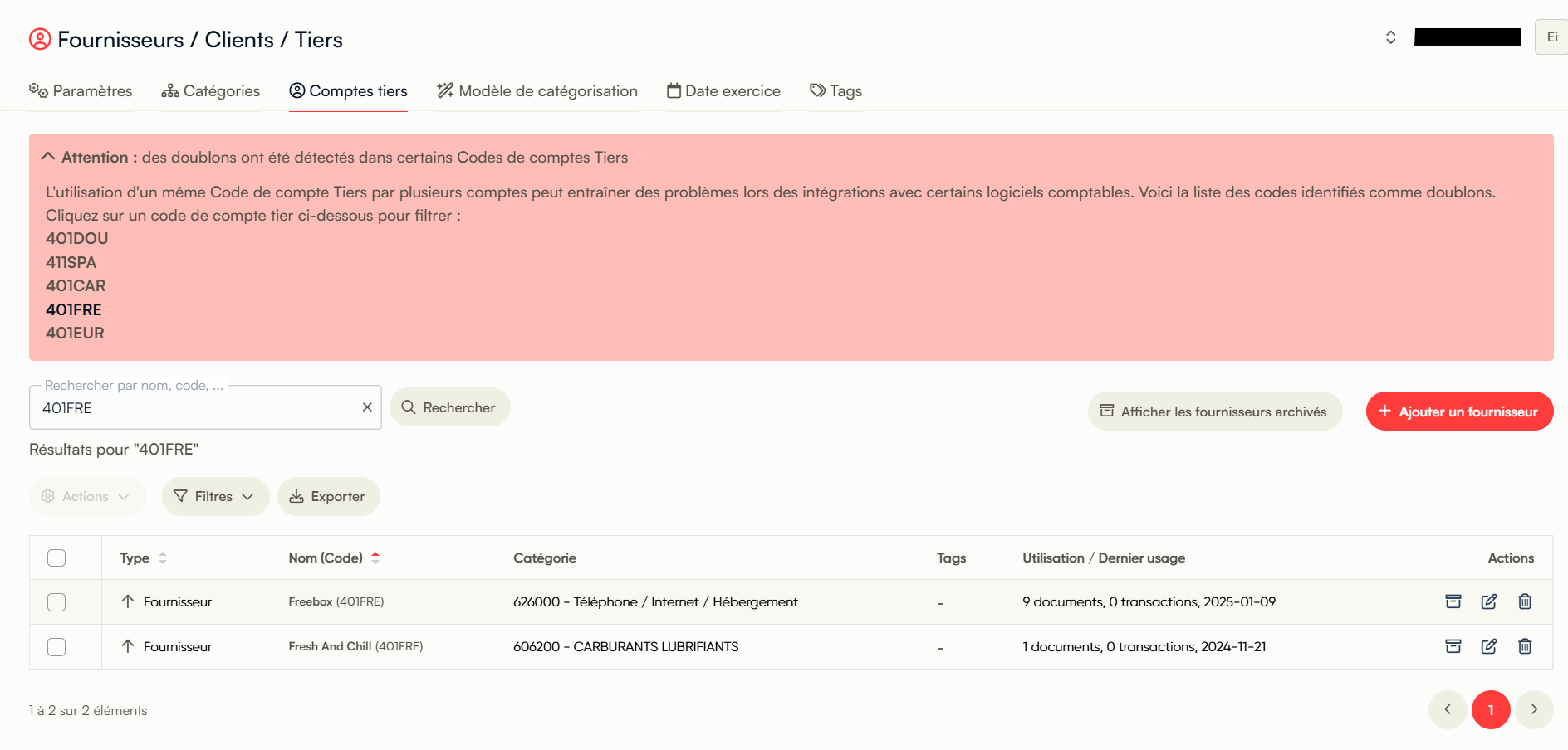 ✅ Accès rapide aux comptes en doublon : Depuis la gestion de vos Comptes Tiers, vous êtes alertés si certains codes sont en doublons, un simple clic sur le code vous permet de lancer une recherche pour retrouver instantanément les doublons🔎